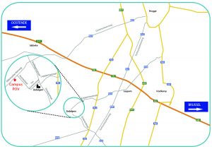 Neem afslag 7bis op de E40 en voeg in op de Koning Albert I Laan (N397) richting Zedelgem/Loppem. Sla rechtsaf bij de Heidelbergstraat (N309). Aan de rotonde rechtdoor (N32 oversteken) naar de Loppemsestraat. Sla rechtsaf bij Snellegemsestraat. Neem de 1ste straat links de Sint-Laurentiusstraat. Deze weg vervolgen in de Kronestraat. Sla linksaf in de Diksmuidse Heirweg. De campus POV ziet u op de linkerkant.