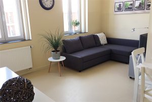 Een korte gang met trap, een woonkamer, een keuken, een toilet, een badkamer, een slaapkamer en 2 verhoorkamers. De bovenverdieping kan enkel gebruikt worden voor gerechtelijk werk (vb. huiszoeking en slechtnieuwsmelding).